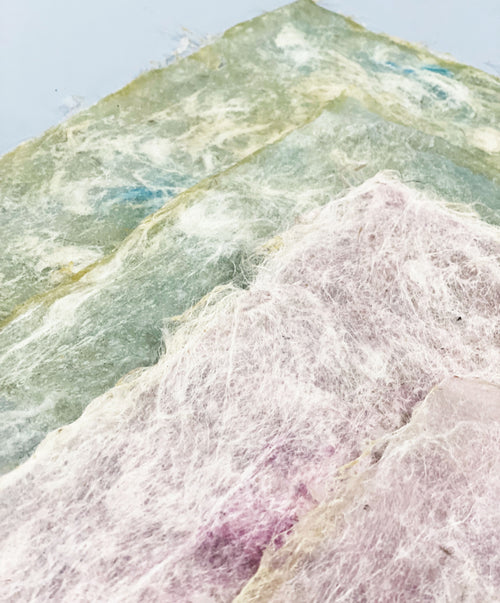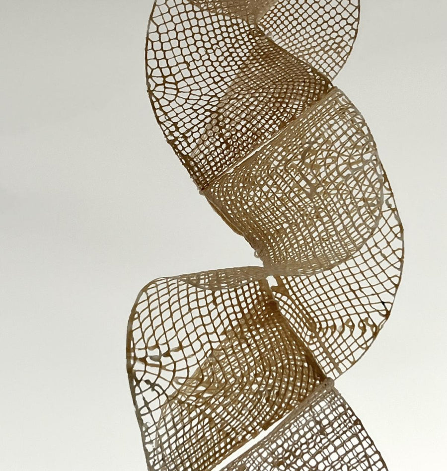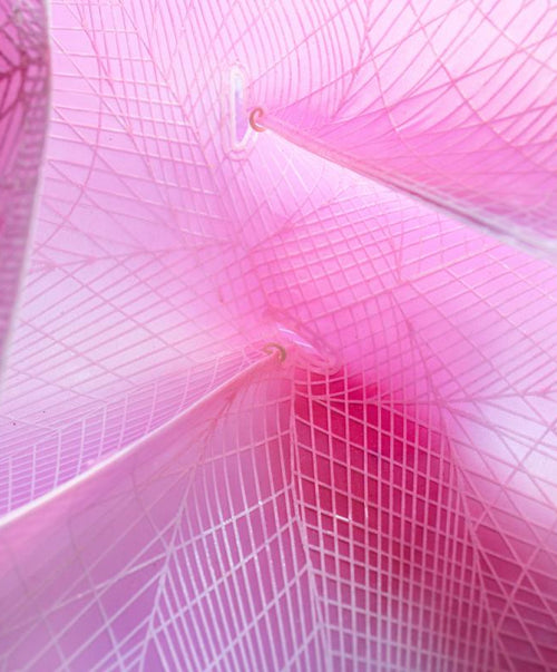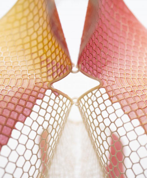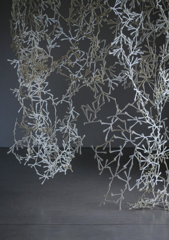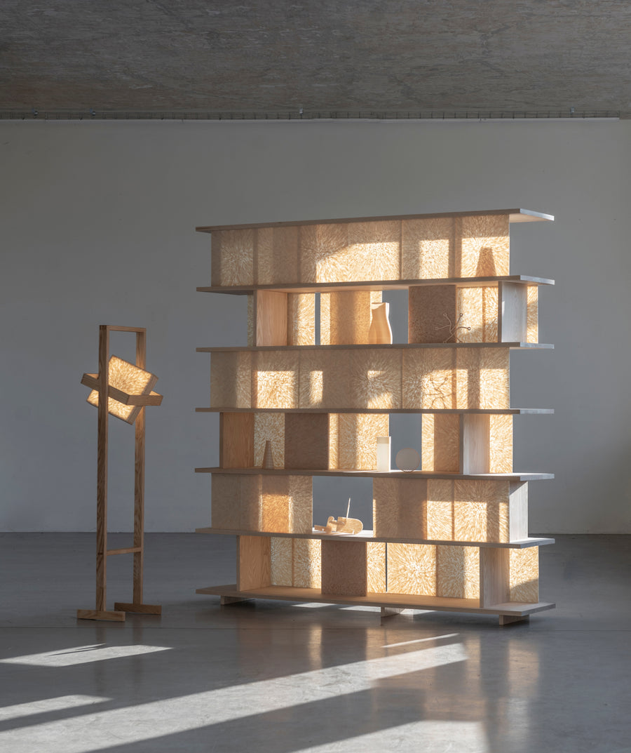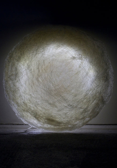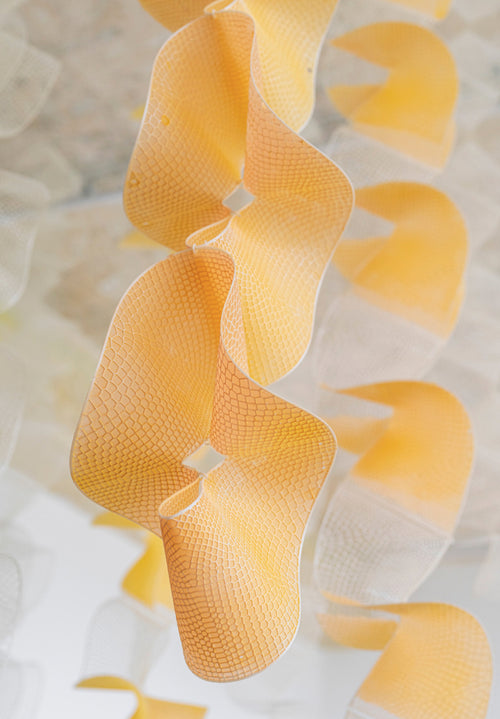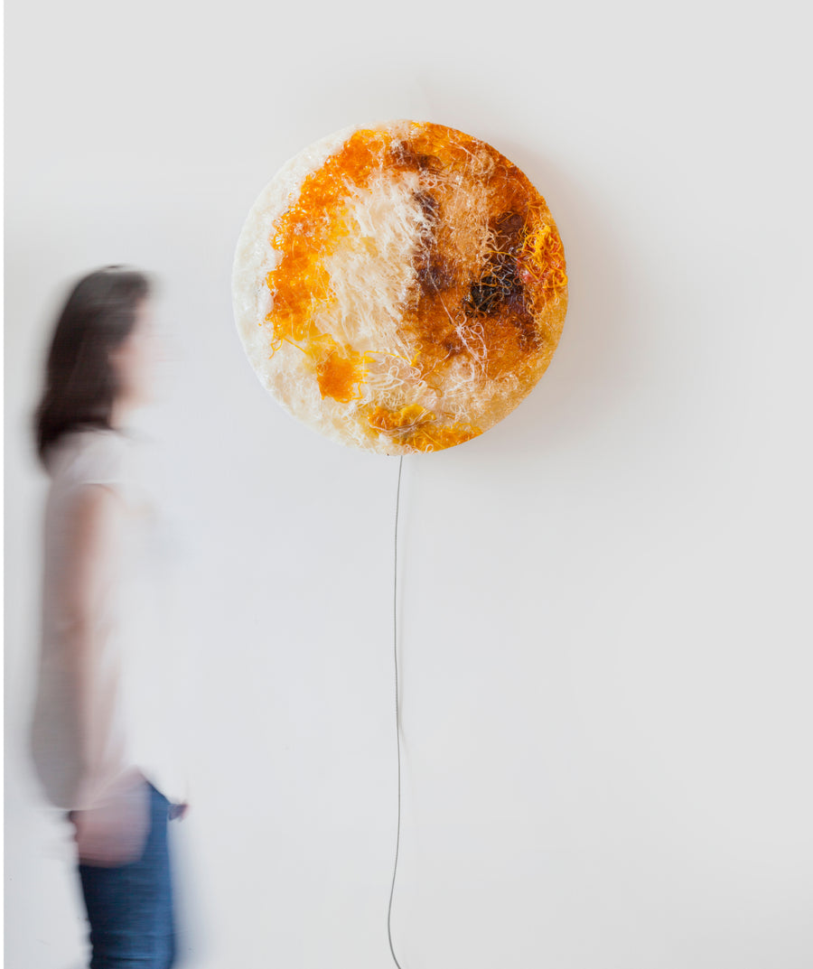 A handmade lighting objects made from bioplastic and colored with natural pigments from flowers and minerals, blending sustainability with artistry.