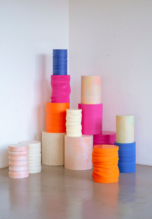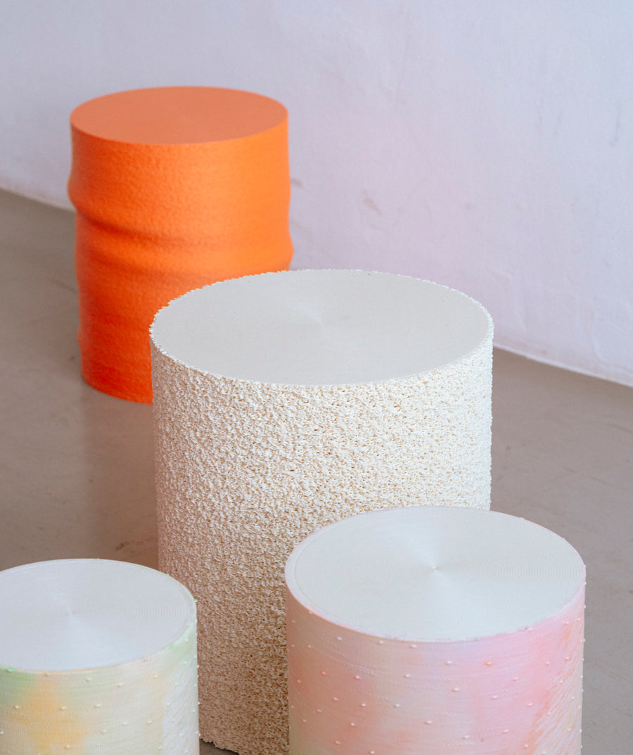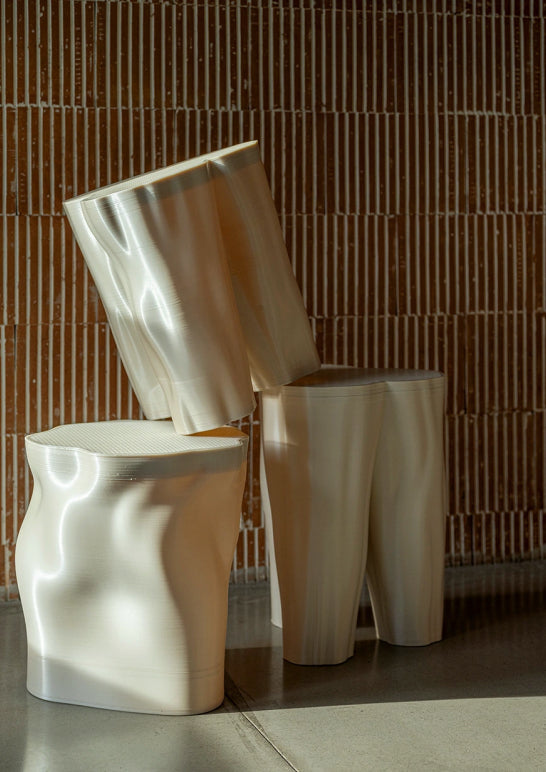 A collection of bioplastic stools and tables with UV-reactive bioskin that change color in real time, showcasing environmentally responsive biomaterials.
