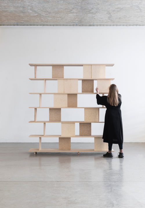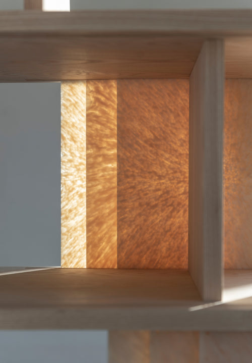 A furniture piece made from wood and recycled bioplastic, adhering to a no-glue, no-screws philosophy, features sliding panels to reveal or conceal contents.
