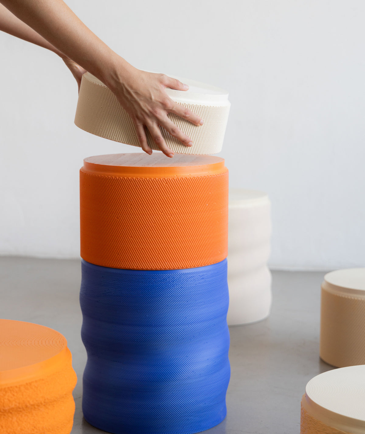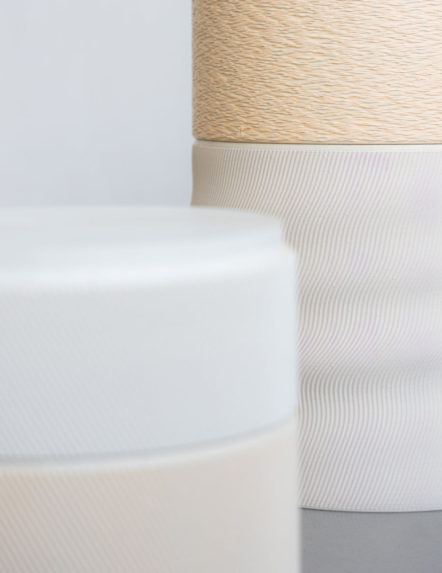 At Alcova Miami 2024, Crafting Plastics invites visitors to experience a fusion of form, fragrance, and interaction. Feel The Matter is a scent-driven, sensory interactive installation that immerses viewers in a deeper connection with responsive biomaterials, inviting them to rethink the boundaries between the tangible and the perceptual. As they approach, the towering columns of sustainable bioplastic stools respond to proximity, releasing subtle, earthy scents that fill the space with a warmth often absent in synthetic materials. The sculpture’s interactivity is further enhanced by its solar-active bioskin, which reacts to UV radiation, dynamically changing color in real-time based on the UV index.