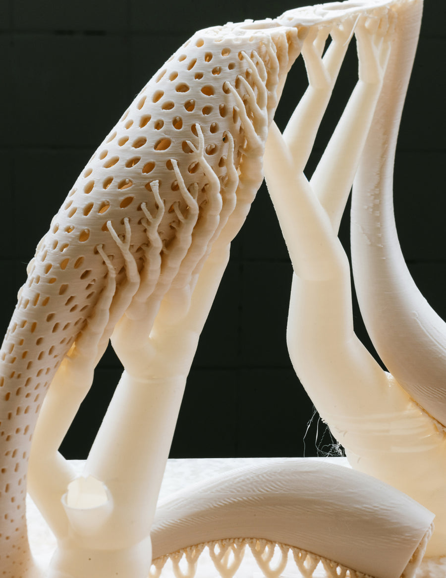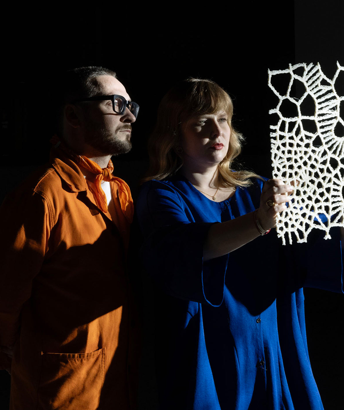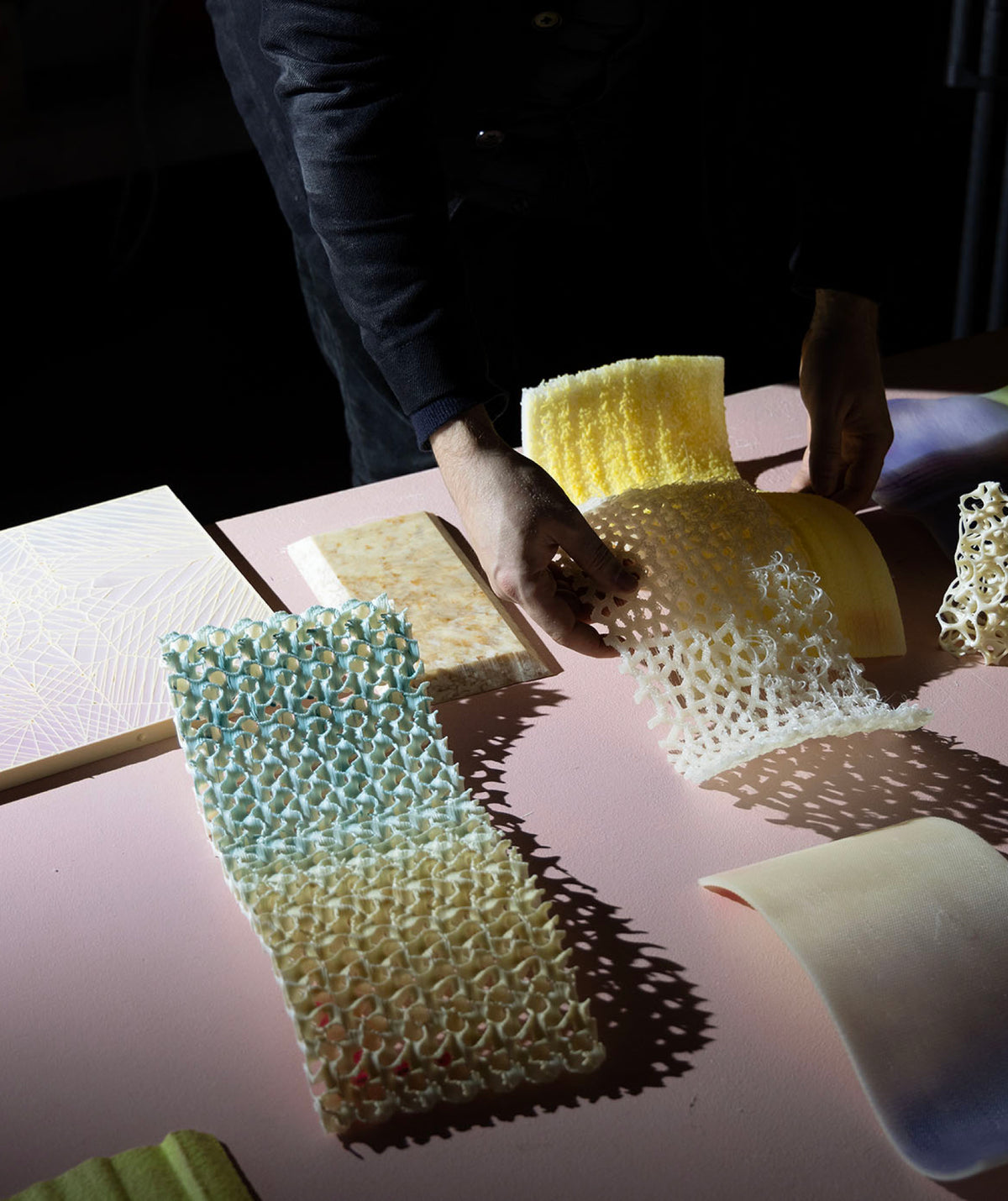 Over 100 unique biomaterial samples have been created for this project, primarily using Nuatan, Crafting Plastics’ innovative bioplastic made from 100% biobased polymers derived from sugars and starches. Additionally, we’ve incorporated a UV-responsive material skin infused with photochromic ingredients, as well as a novel bamboo-algae-based leather developed specifically for this project.