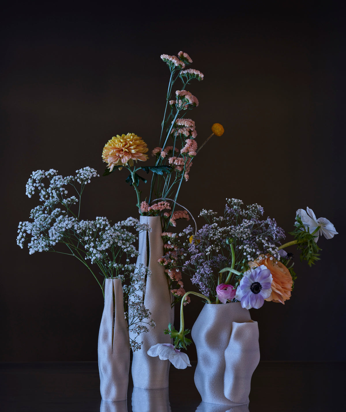 Collection 11 is a series of vases we created from a 100% biobased and biodegradable material blend. With these designs, we aim to offer a sustainable alternative to plastics and invite our customers to join the movement for change. The vases are available in three sizes—small (22–27 cm in height), medium (42–60 cm in height), and large (120 cm in height)—and come in two color options: beige and black.