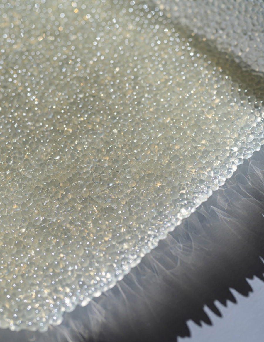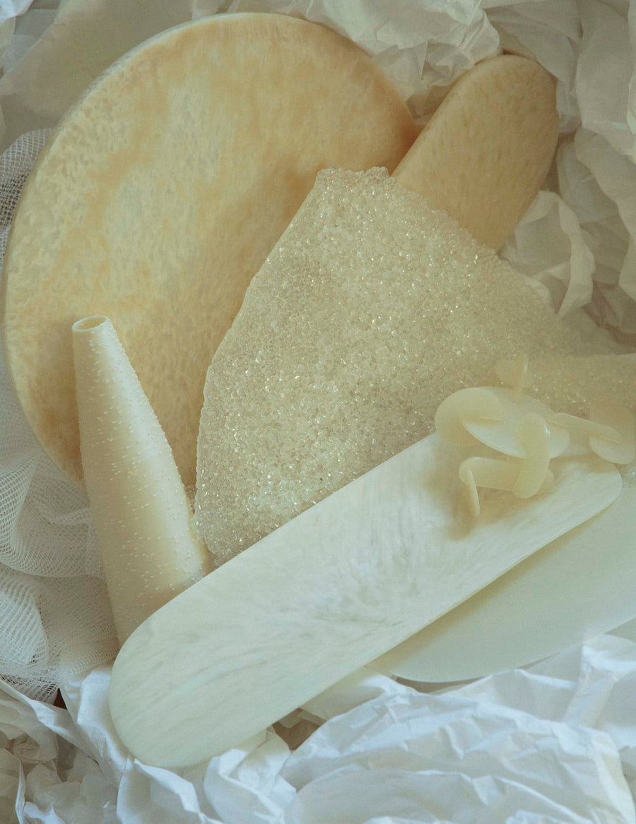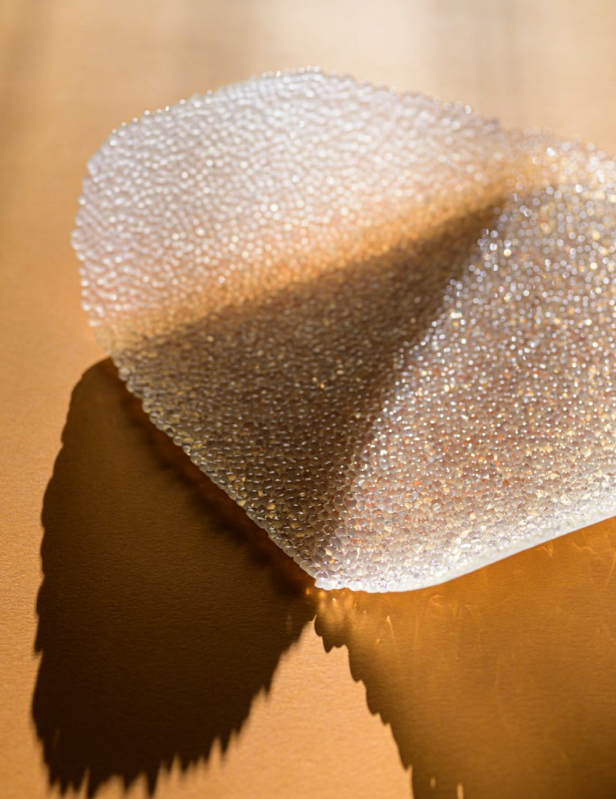 Bubble Tray, a hand-shaped pearly tray, might remind you of the Ostblock’s glass lamps and stained glass door from the 70’s, but this one is made purely from biopolymers. For this product we decided to influence the tactile experience and surface structure by controlling the length of the biopolymer’s crystallization process. It is 100% biobased and biodegradable in industrial compost. Bubble tray is now available in our shop.