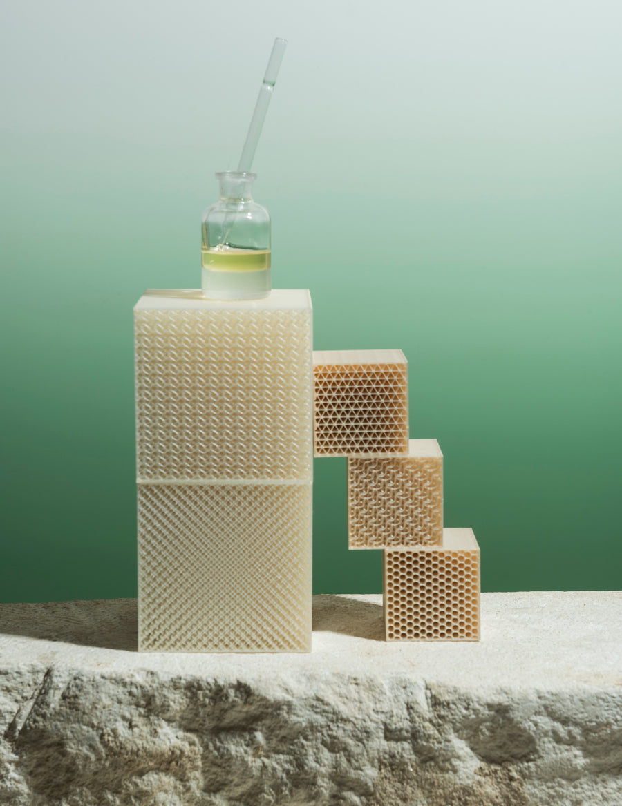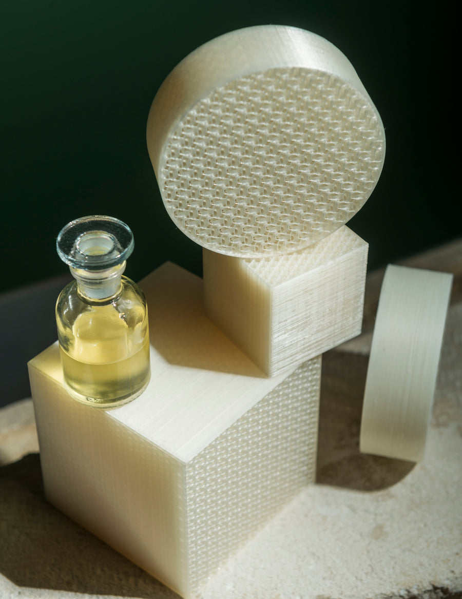To bring this idea to life, we’ve designed small objects: 3D-printed analog diffusers crafted entirely from biobased materials. These are available alongside one of two unique essences developed in collaboration with scientist Karol Červenčík. Experience the purifying aromas emanating from bioplastic diffusers—bringing a sense of renewal to your space, your world, and yourself.