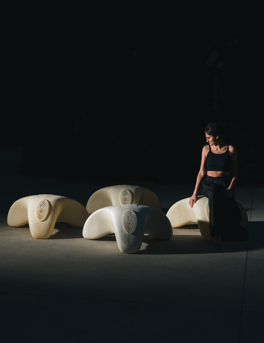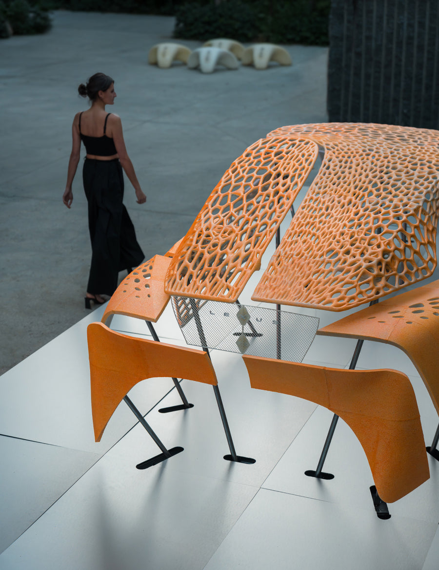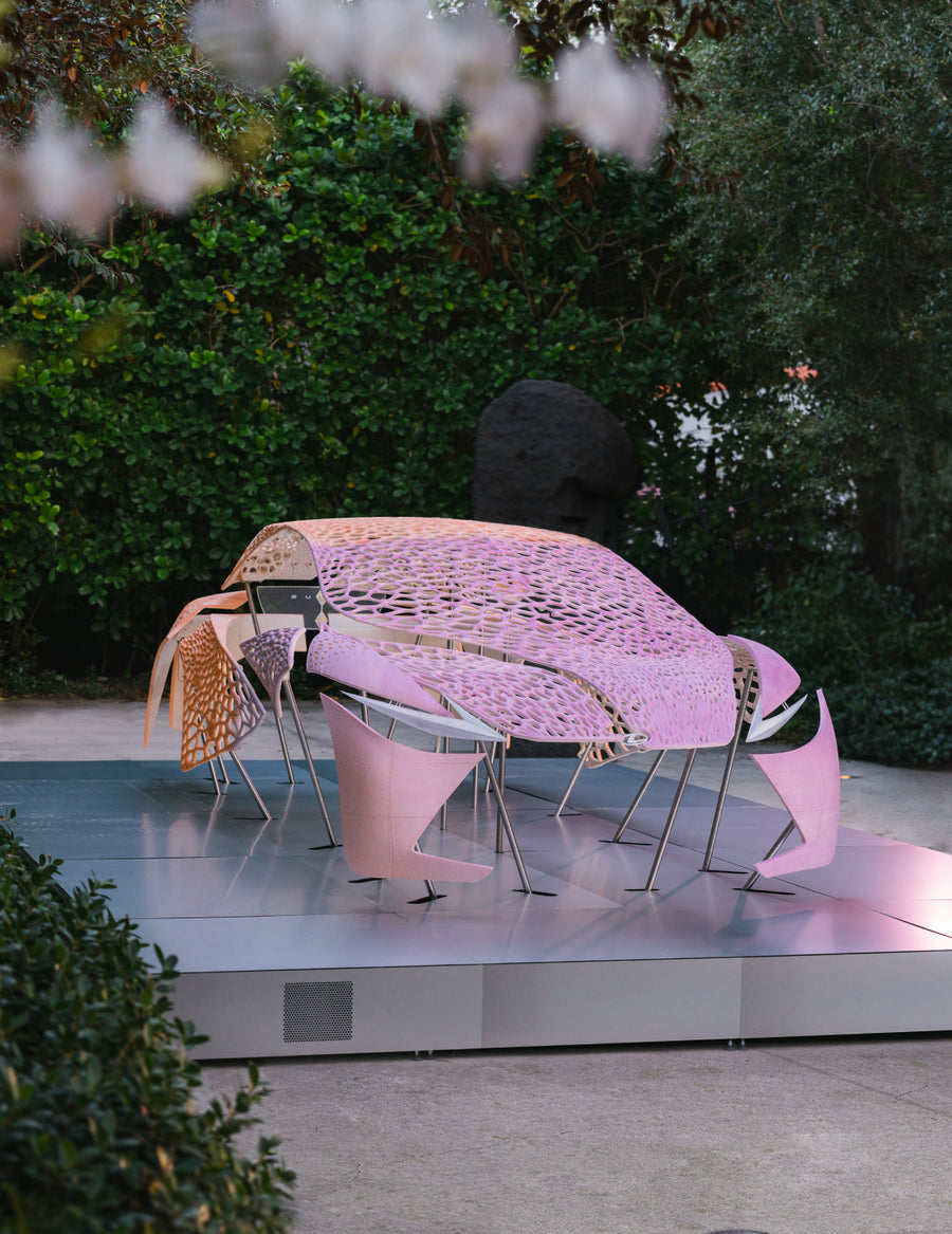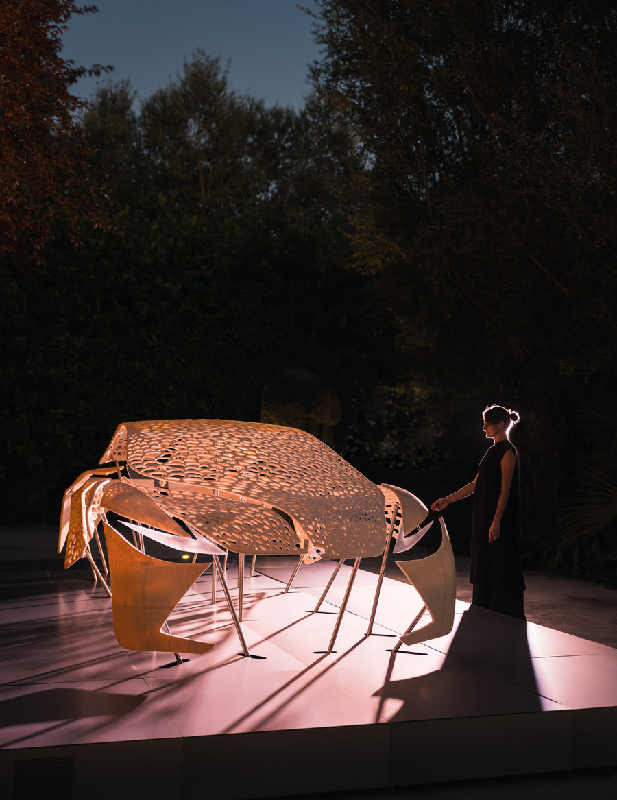 Nearby, a second piece transformed the contours of the vehicle’s steering wheel into a tactile, flower-shaped sculpture. As visitors approached, the sculpture emitted an audio soundscape, inviting interaction. Seating sculptures inspired by the LF-ZC’s headrest added another sensory dimension, releasing a Lexus-inspired aromatic mist. This multisensory experience offered guests a serene sanctuary within the sculpture garden. Finally, an undulating lattice-like sculpture at the edge of the garden revealed the Lexus logo in a UV-sensitive bioplastic, shifting in response to the breeze.