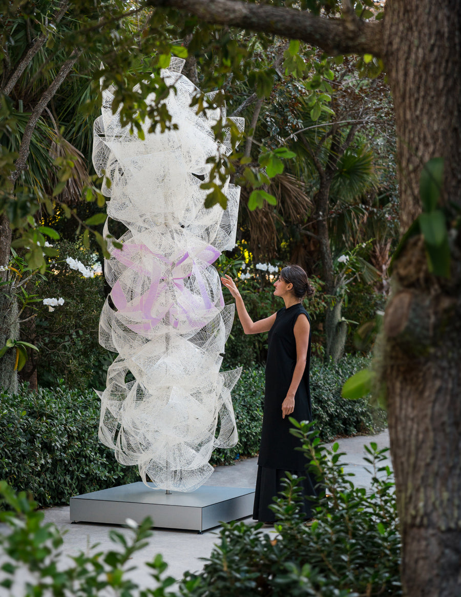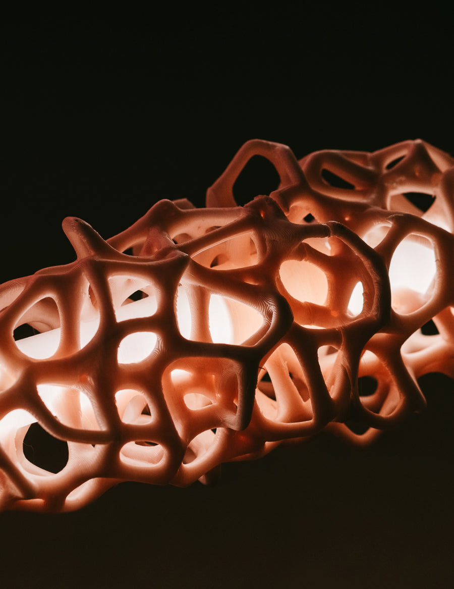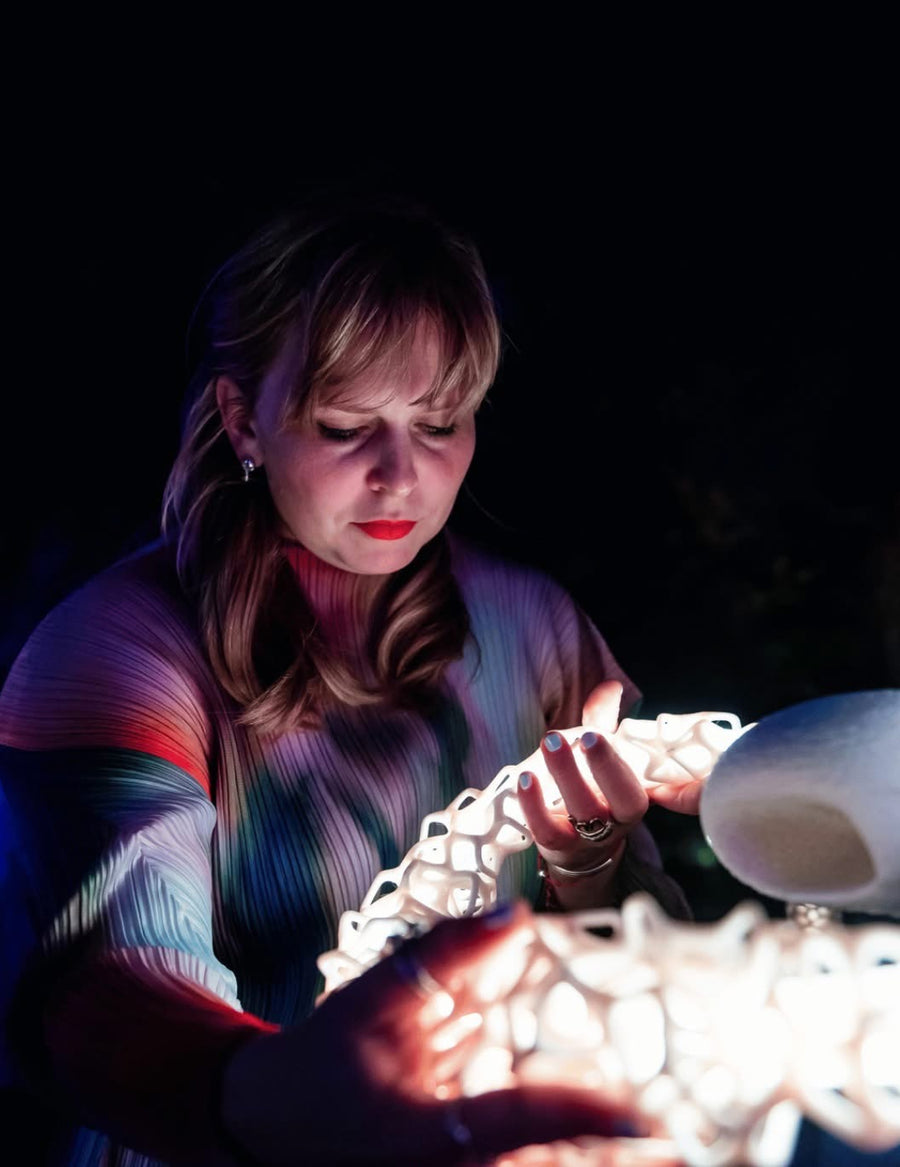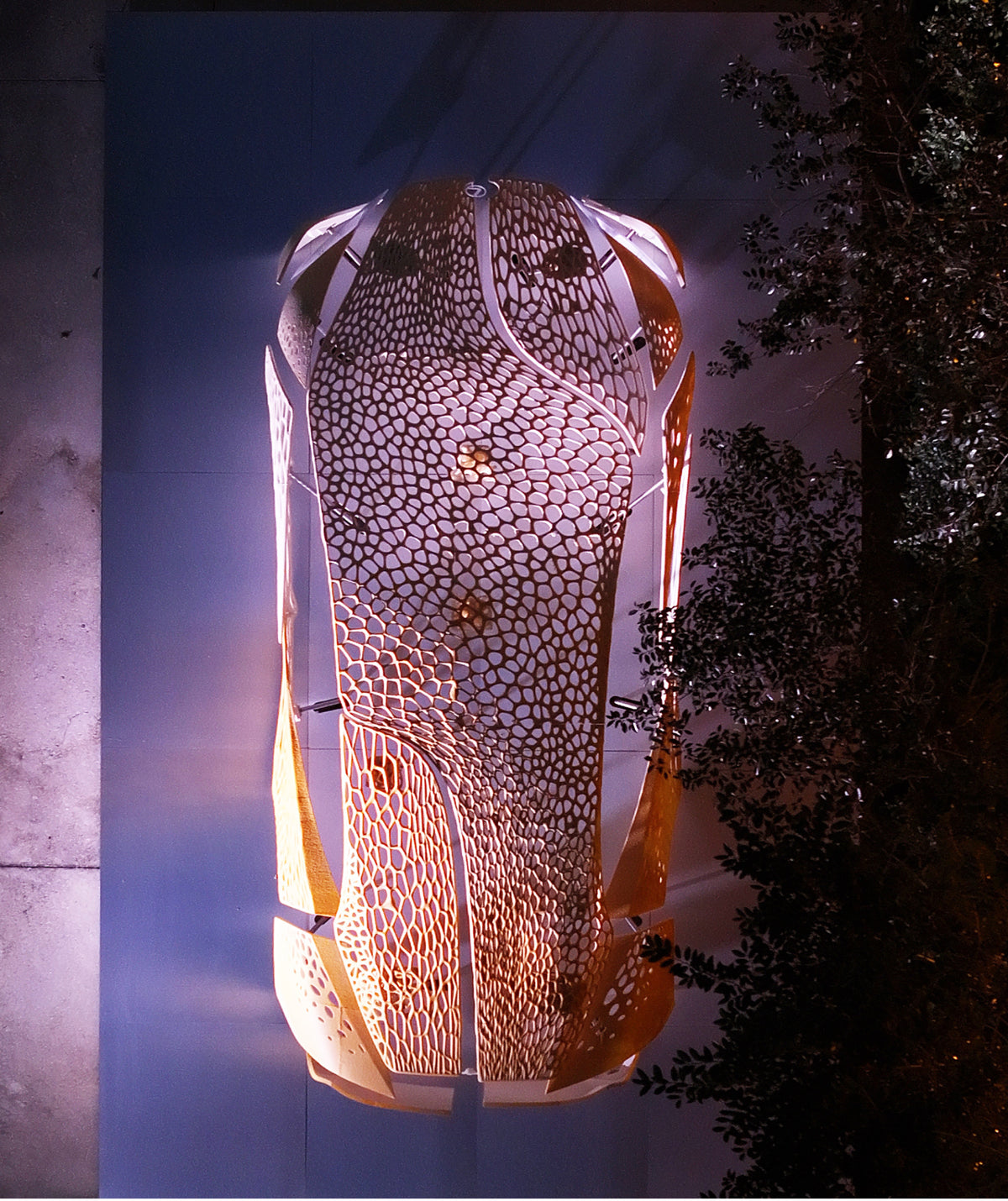 Nearby, a second piece transformed the contours of the vehicle’s steering wheel into a tactile, flower-shaped sculpture. As visitors approached, the sculpture emitted an audio soundscape, inviting interaction. Seating sculptures inspired by the LF-ZC’s headrest added another sensory dimension, releasing a Lexus-inspired aromatic mist. This multisensory experience offered guests a serene sanctuary within the sculpture garden. Finally, an undulating lattice-like sculpture at the edge of the garden revealed the Lexus logo in a UV-sensitive bioplastic, shifting in response to the breeze.