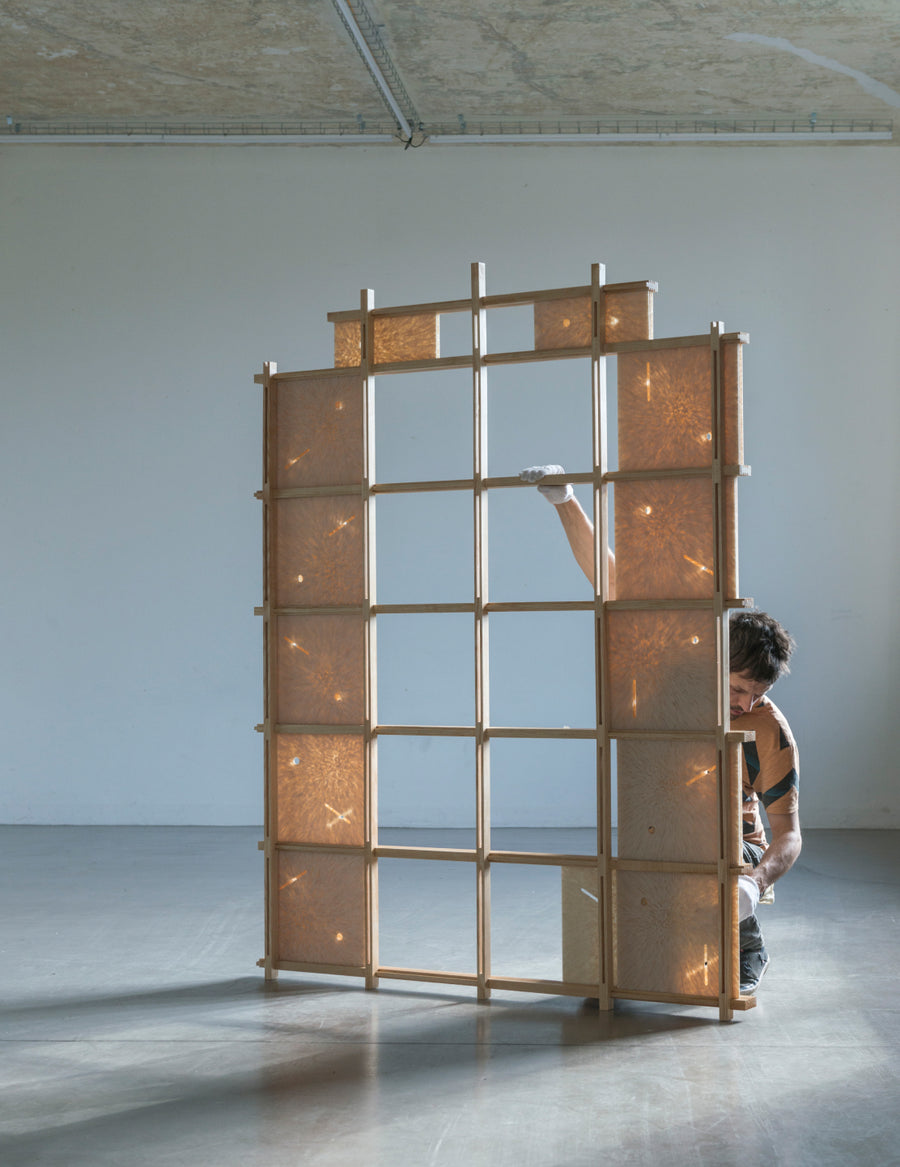 A large-scale object is crafted using two natural materials: Nuatan® bioplastic sheets, representing the new sustainable generation of plastics, and locally sourced wood, a symbol of traditional sustainability. With no screws or glue, the structure relies entirely on a traditional wooden joinery system, ensuring both materials decompose within the same timeframe and promoting circular design principles.